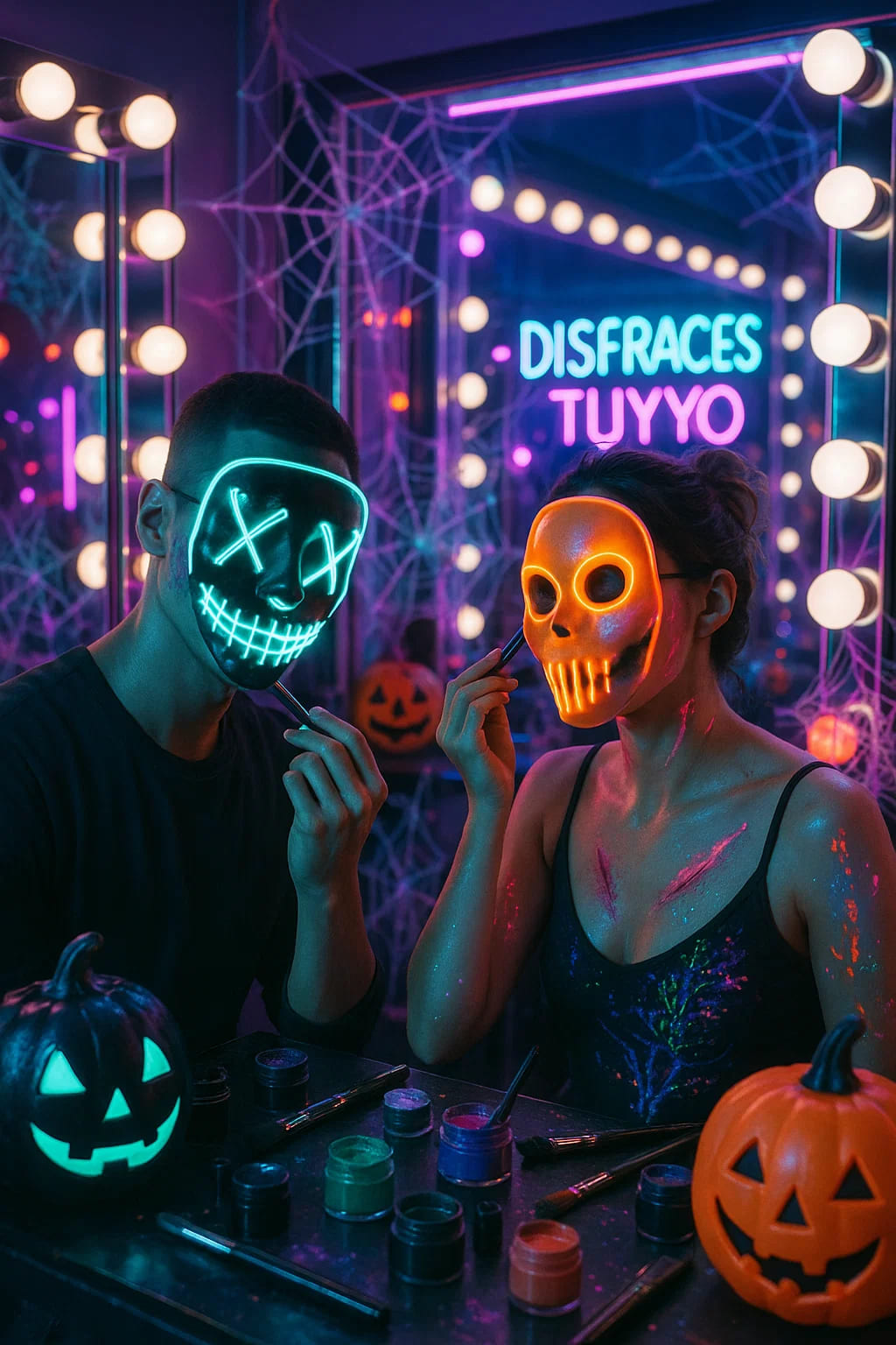 Entre las opciones más populares destacan los trajes de esqueletos con luces integradas, las momias con vendas brillantes o los zombies con pintura UV. También los personajes del cine y las series se reinterpretan: un Ghost Face con máscara translúcida, una bruja futurista con peluca luminosa o un payaso siniestro con purpurina.