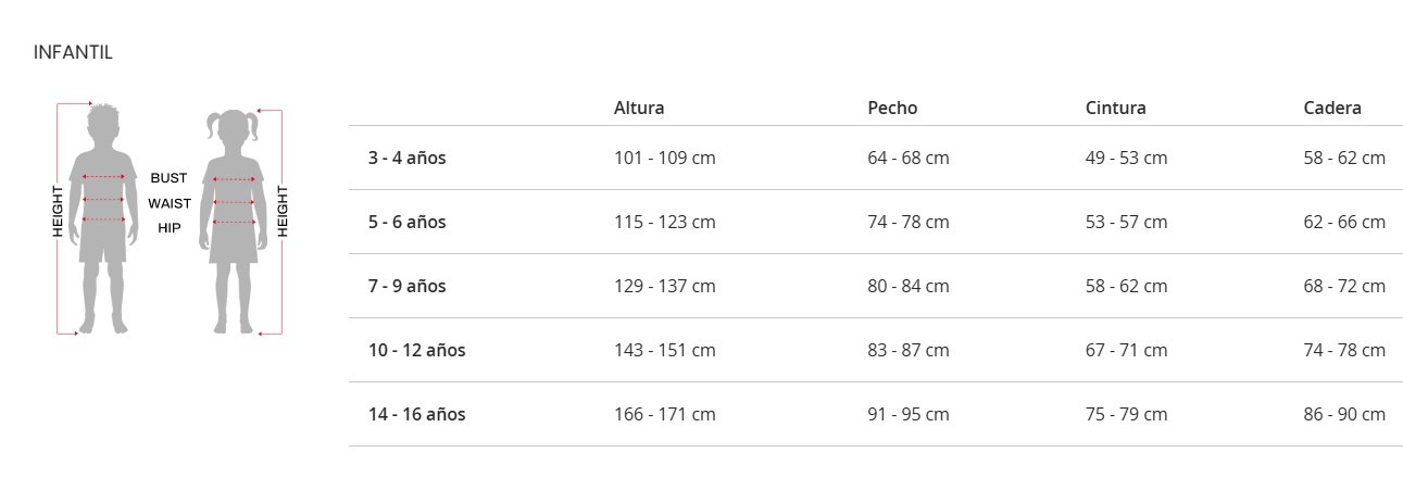 | Edad aproximada | Altura (cm) | Pecho (cm) | Cintura (cm) |